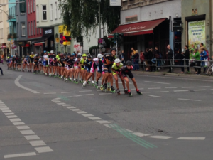 Estére programunk van, a berlini nagykövetség szervez a kint élő és/vagy a versenyen induló magyarok számára egy tésztapartit, ahol a Suhanj számára gyűjtenek adományokat. Ahogy utazunk a követségre, belefutunk a görkorisok mezőnyébe. Egészen elképesztő, szombat délután a görkorcsolyásoké az utca, ők teljesítik a maratoni távot, kicsit módosított útvonalon, de majdnem ott, ahol másnap majd mi fogunk futni. Hihetetlen sebességgel haladnak, félelmetes a kívülálló számára.